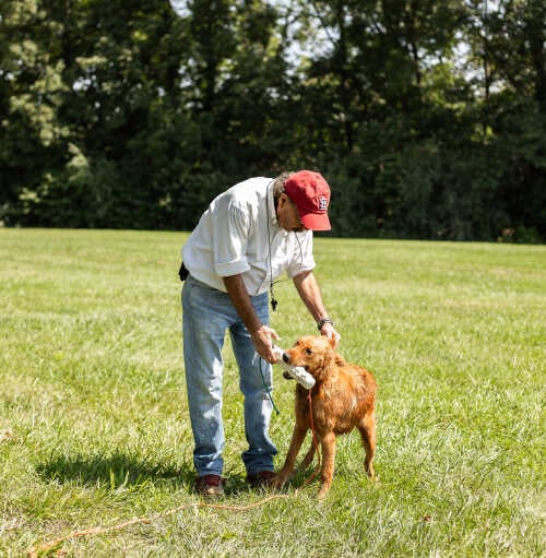 Mike Pind works with Rover, a golden retriever from Houston. Pind says he loves getting to work outside, and works at training the dogs 365 days a year, no matter what the weather is like.