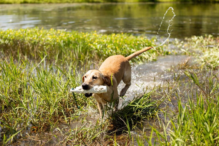 Jet splashes out of the water during a training session with Mike Pind. Pind trains approximately nine dogs at a time.